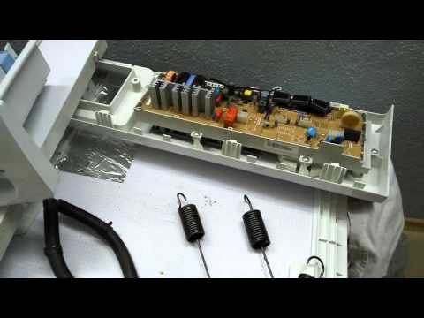 3. Извлеките управляющий блок. Открутите винты в верхнем отделении передней панели. Отверните блок на 90 градусов и снимите его с крепления. Воспользовавшись сервисным крюком, закрепите панель сбоку от стиральной машины.